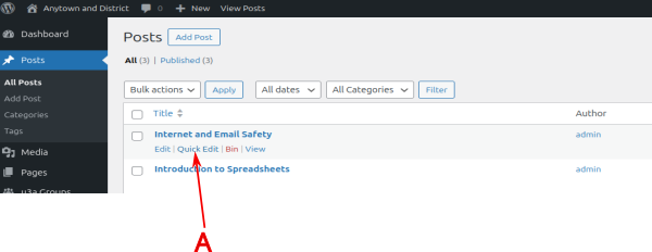To change the WordPress page or post author, select the required page or post from the WordPress dashboard. Hover the mouse over the page or post you wish to change and then click the ‘Quick Edit’ link under it (A).