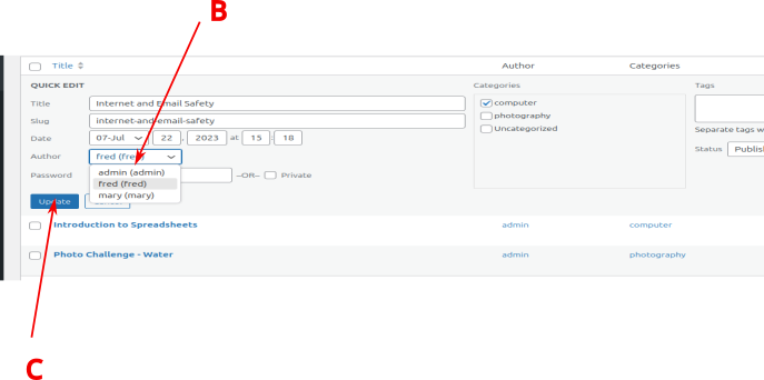 This will open up the Quick Edit tab on the screen. From here, click on the current author’s name and select a new author from the dropdown menu (B). Finally, click the ‘Update’ button to save your changes (C).