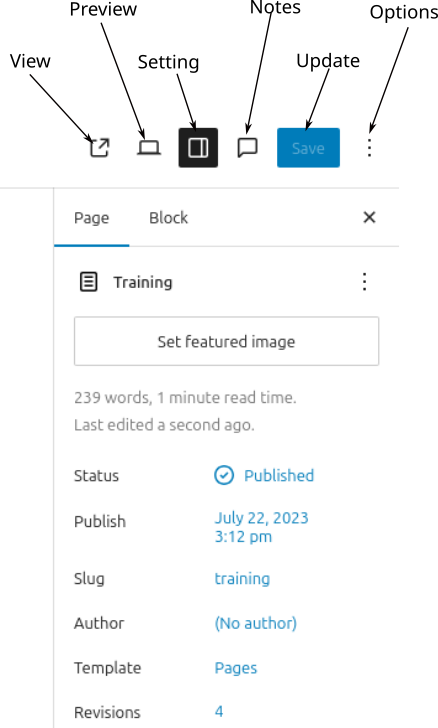 - Update the page. This will show Save or Publish if the page has not been previously published.