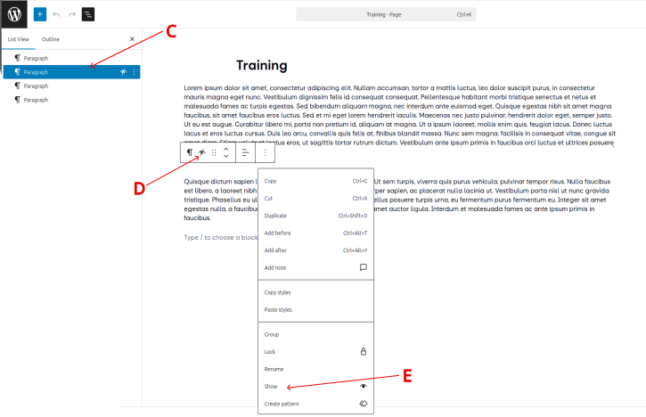 Once selected, the paragraph is hidden from view, but remains in the list view with the hidden icon appended (C). To restore, select the block in the list view. This will reveal the block’s edit bar; then, select either the hidden icon (D) or Show in option list(E).