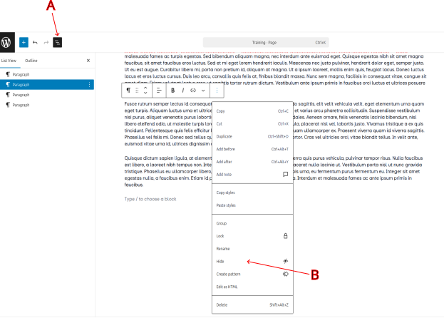 To hide a block, ensure that the List View is selected (A), then select Hide from the block’s option list (B):
