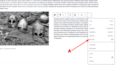 To aid collaboration, content providers can write notes and reply directly at the individual block level, providing tracking changes and feedback during the editing process. Notes can be resolved, edited, and deleted; email notifications are sent to the post’s author when a new one is left. To add a note, from the block’s toolbar, select Add Note (A). This will grey out all the other blocks except the one the note is attached to, and a panel will appear on the right-hand side of the screen where the note can be added. When completed, confirm by selecting Add Note in the note box.