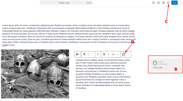 Once a note has been added, it can be edited or deleted. If a note has been added, an icon will appear on the block editor’s administrative toolbar (C) and the block toolbar (D), identifying the note’s creator. On selecting either they notes(s) will appear (B).
